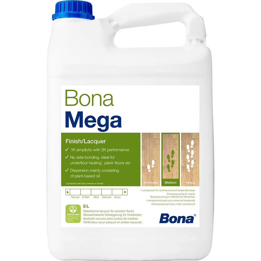 Bona Mega is a one-component waterborne lacquer that has become a benchmark in wood floor finishing. Powered by oxygen-crosslinking technology, it offers the durability of a two-component system without the need for mixing. With fast drying times, low odour and excellent resistance to wear, it is ideal for both residential and light commercial wooden floors.