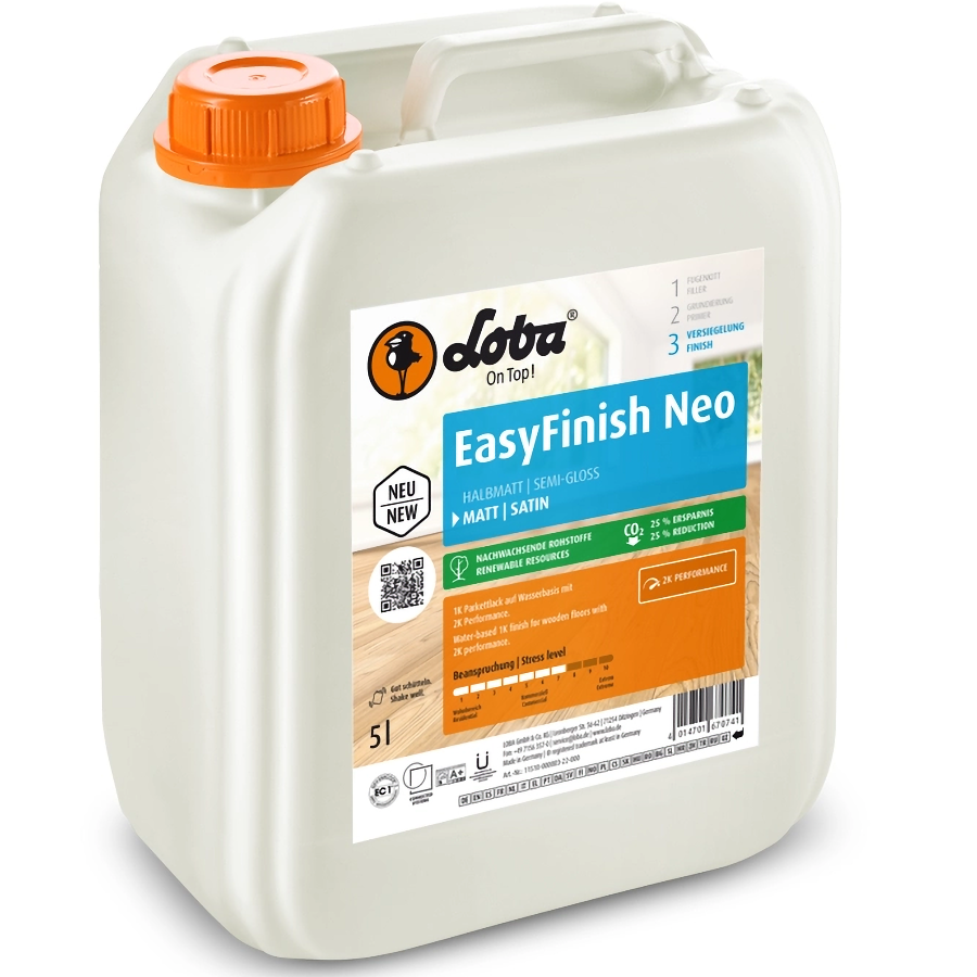 LOBA EasyFinish NEO is a next-generation one-component waterborne polyurethane finish for wooden floors, offering exceptional durability, easy application, and a beautiful, natural appearance. Designed for both residential and commercial environments, EasyFinish NEO provides outstanding chemical and mechanical resistance while maintaining a smooth, even surface with minimal grain raise. Its advanced NEO formula ensures high build, clarity, and wear resistance comparable to two-component finishes – without the need for a hardener.